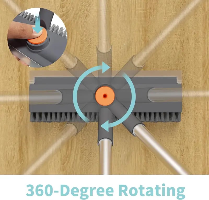 360-degree Rotating Floor BrushBy continuously pressing the center button, you can freely rotate the floor scrub brush in a 360-degree direction. Every 90-degree rotation will produce a "click" sound, indicating the presence of a latch that allows you to lock the rotating angle in place.